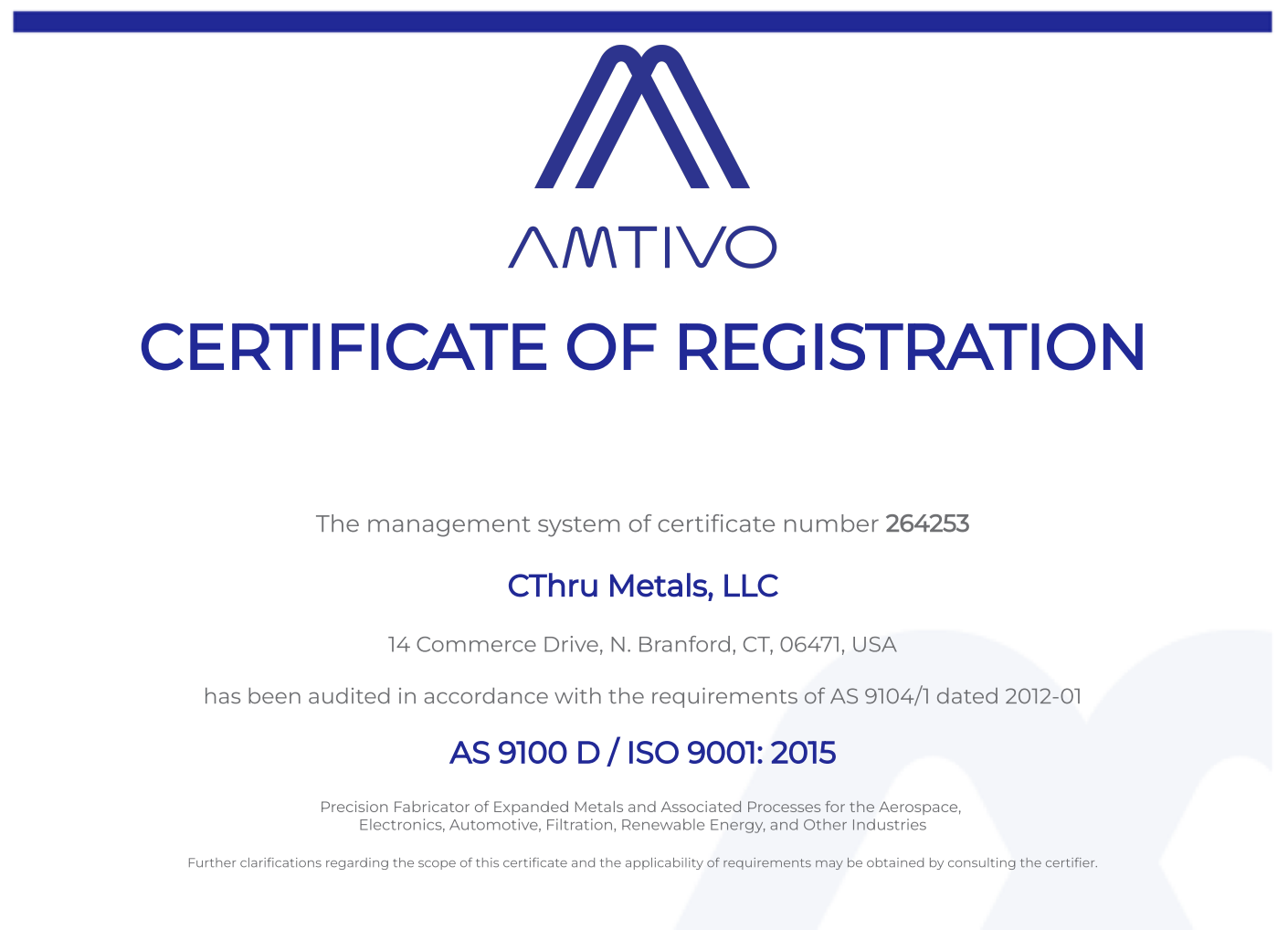 CThru Metals is certified to the AS9100D & ISO 9001:2015 standards to show our ability to consistently provide products and services that meet customer and applicable statutory and regulatory requirements.